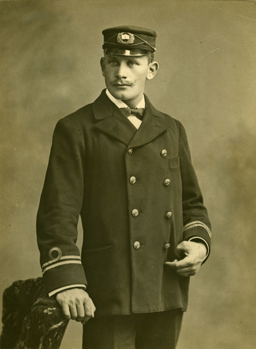 Svartvit studiofotografi av Oscar som andre styrman ombord S/S OTTO av Göteborg 1902. Fotografiet är taget i Stockholm hos Zielfeldt på Klarabergsgatan 33 juli 1902.