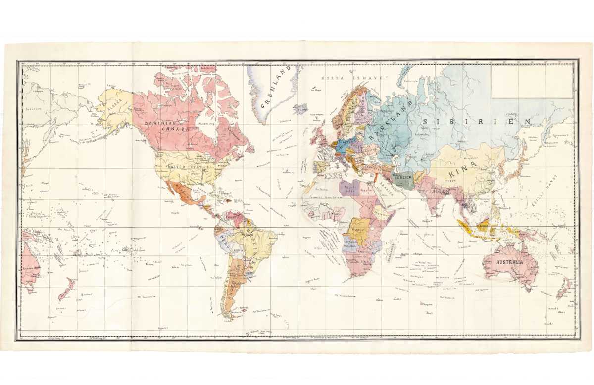 Handritad karta tillverkad av Oscar. Kartan föreställer världen mellan åren 1895-1917. Oscar har markerat ut ruter, år och fartygsnamn, på alla resor mellan dessa år som han varit med om.