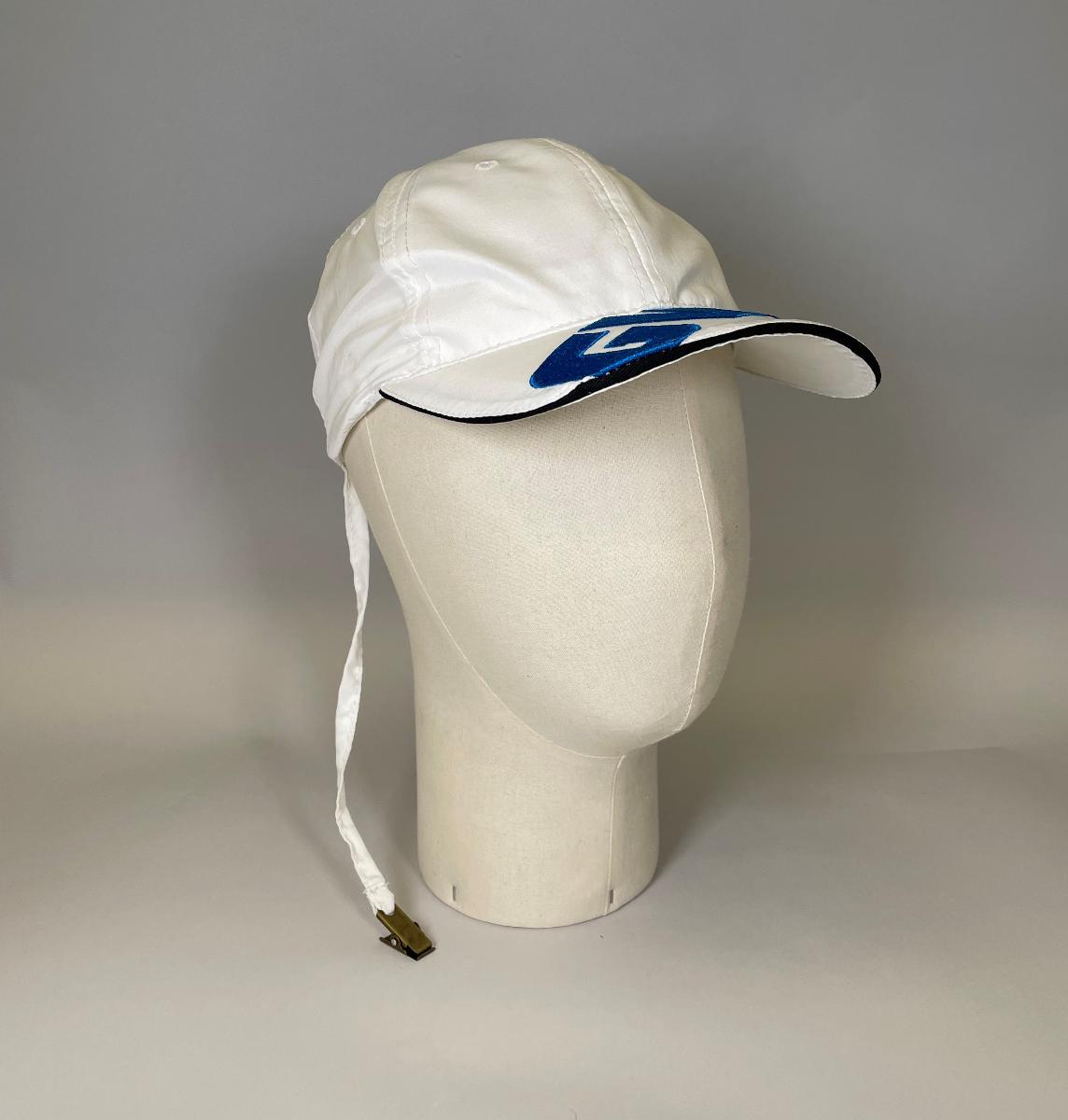 Vit keps med blå broderad text på skärmen. Keppsen har ett metallspänne på en snodd för att kunna fästa den vid kragen på jackan.