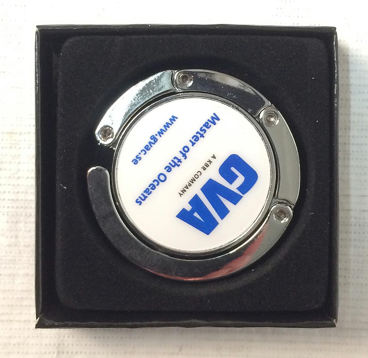 Portabel hängare att fästa på bordskanten för kavajen eller handväskor. Delades ut som reklam.