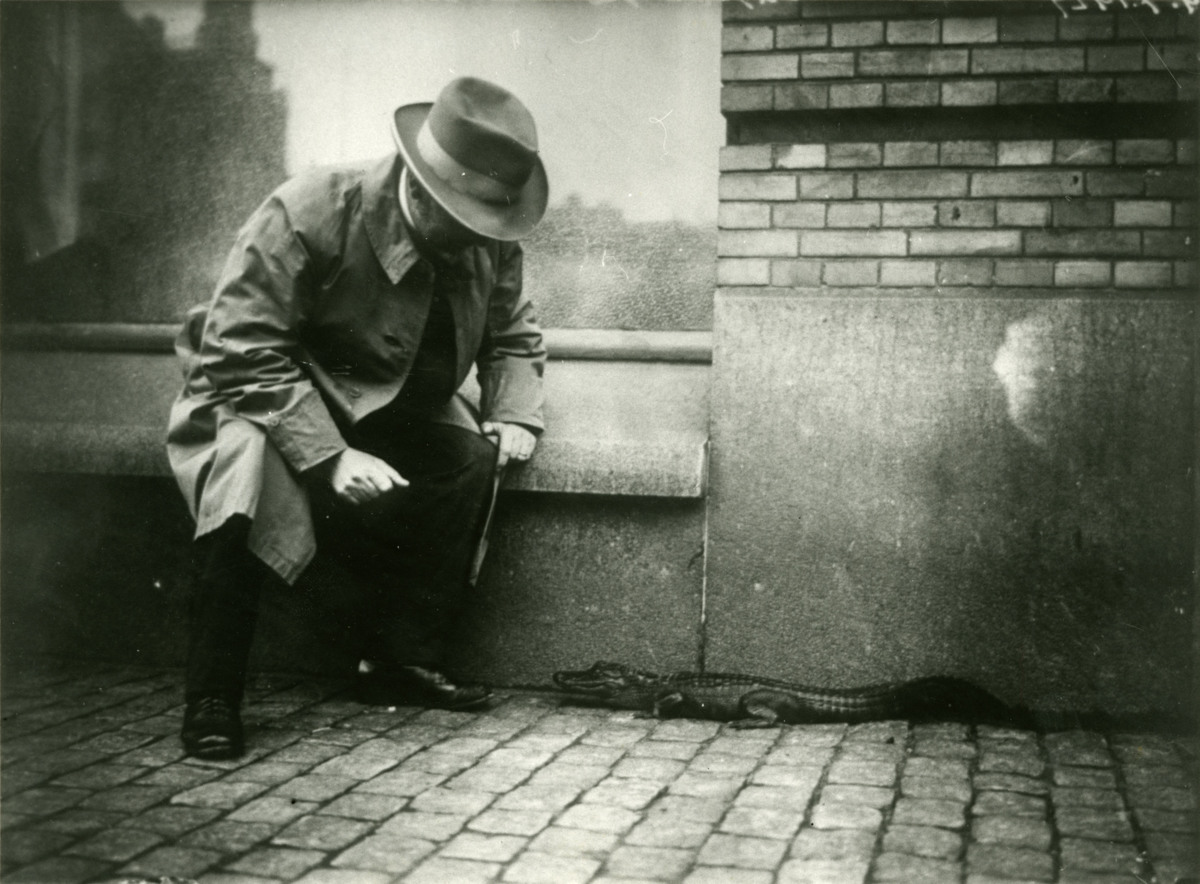 Akvariechef Hjalmar Östergren sitter på huk utanför Ostindiska huset (nuvarande Göteborgs Stadsmuseum). Bredvid sig på marken har han alligatorn "Smilet". Fotografiet är taget år 1924 då "Smilet" var cirka tre år gammal.