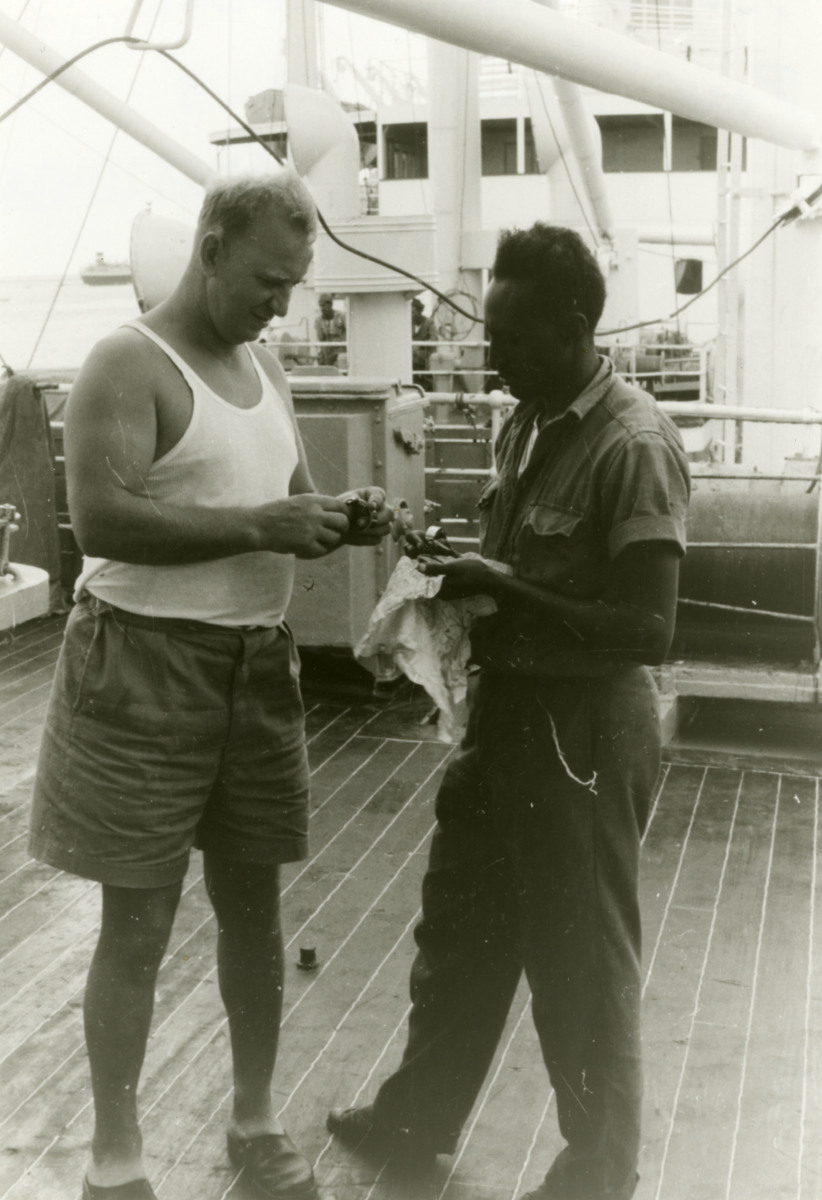 Foto av två män som tittar på ett armbandsur ombord ett fartyg