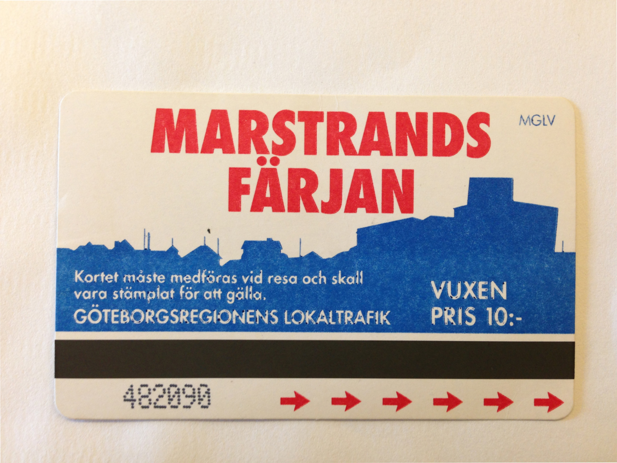 Tryck: Marstrandsfärjan. MGLV. Kortet måste medföras vid resa och skall vara stämplat för att gälla. Göteborgsregionens lokaltrafik. Vuxen pris 10:-. 482090