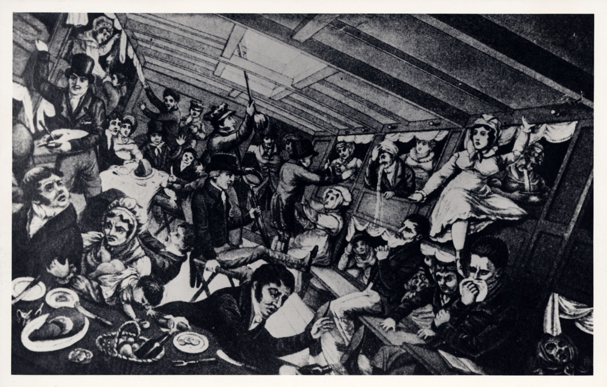 Påskrift: Interiör från ett emigrantfartyg på 1850-talet