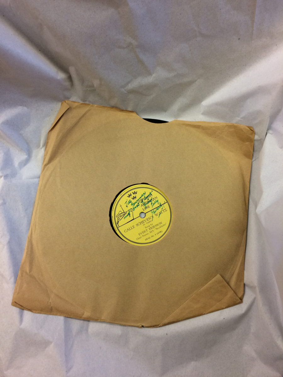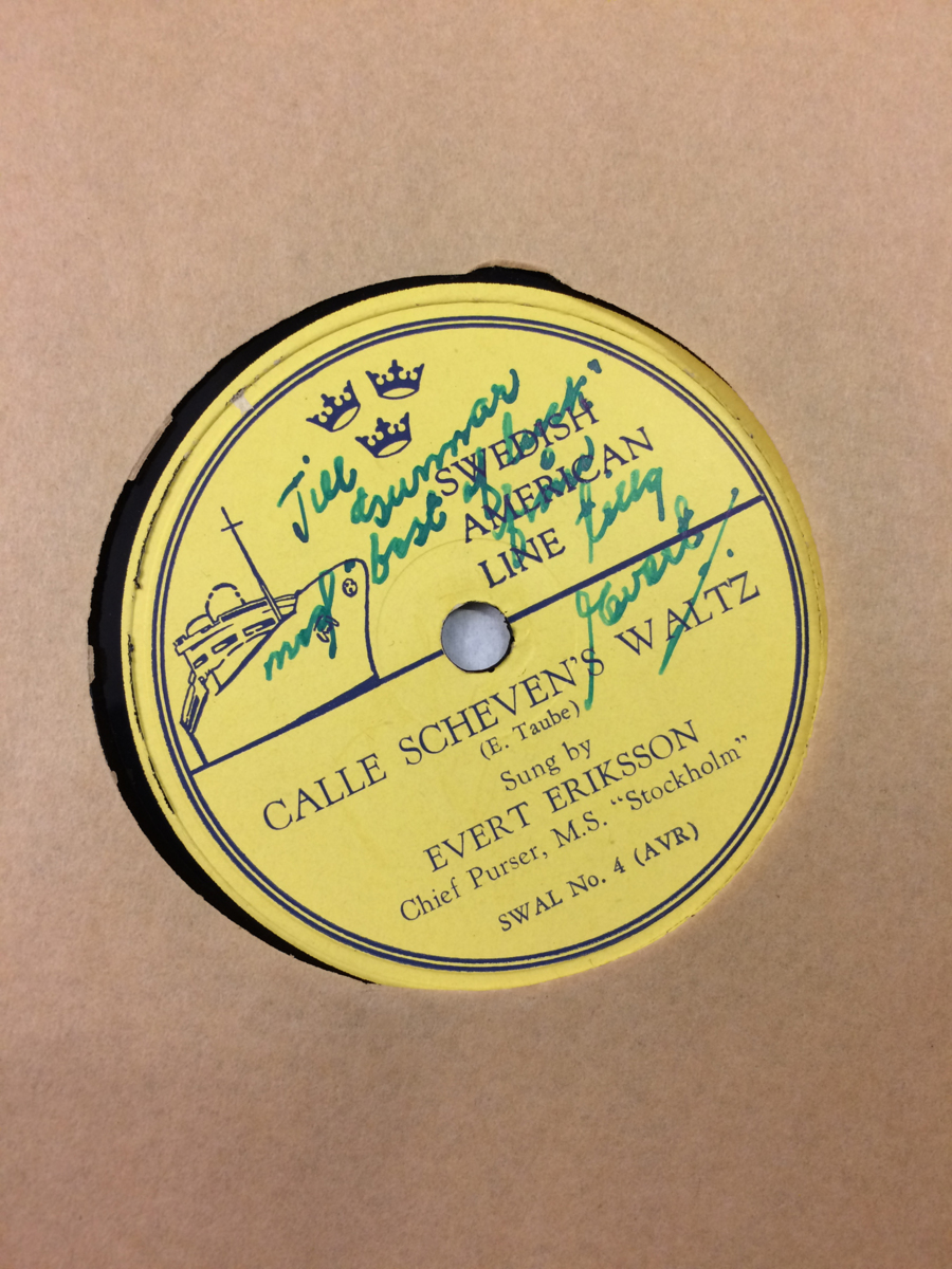 Svart LP-skiva med gula etiketter med blått tryck, producerad för Svenska Amerika Linien. Skivan innehåller två av Evert Taubes visor - Kalle Schevens vals och Rosa på bal. Visorna är framförda av orkestern ombord och sångaren är Evert Eriksson som var Chief Purser ombord M/S STOCKHOLM.