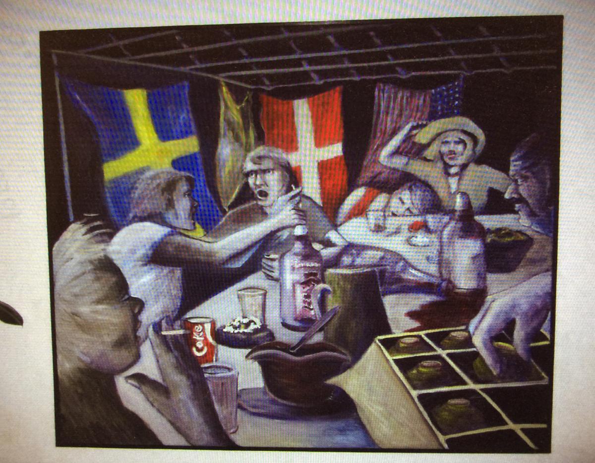 Oljemåling på duk i svart enkel träram. Föreställer en blöt kväll ombord. Personalen har personalfest och sitter kring ett bord, två personer argumenterar högt med varandra någon röker, en person har fått för mycket att dricka och ligger sovandes i en kvinnas knä. Någon tar en chokladbit från en ask. På bordet finns flaskor och glas. I bakgrunden hänger den svenska, danska och amerikanska flaggan.