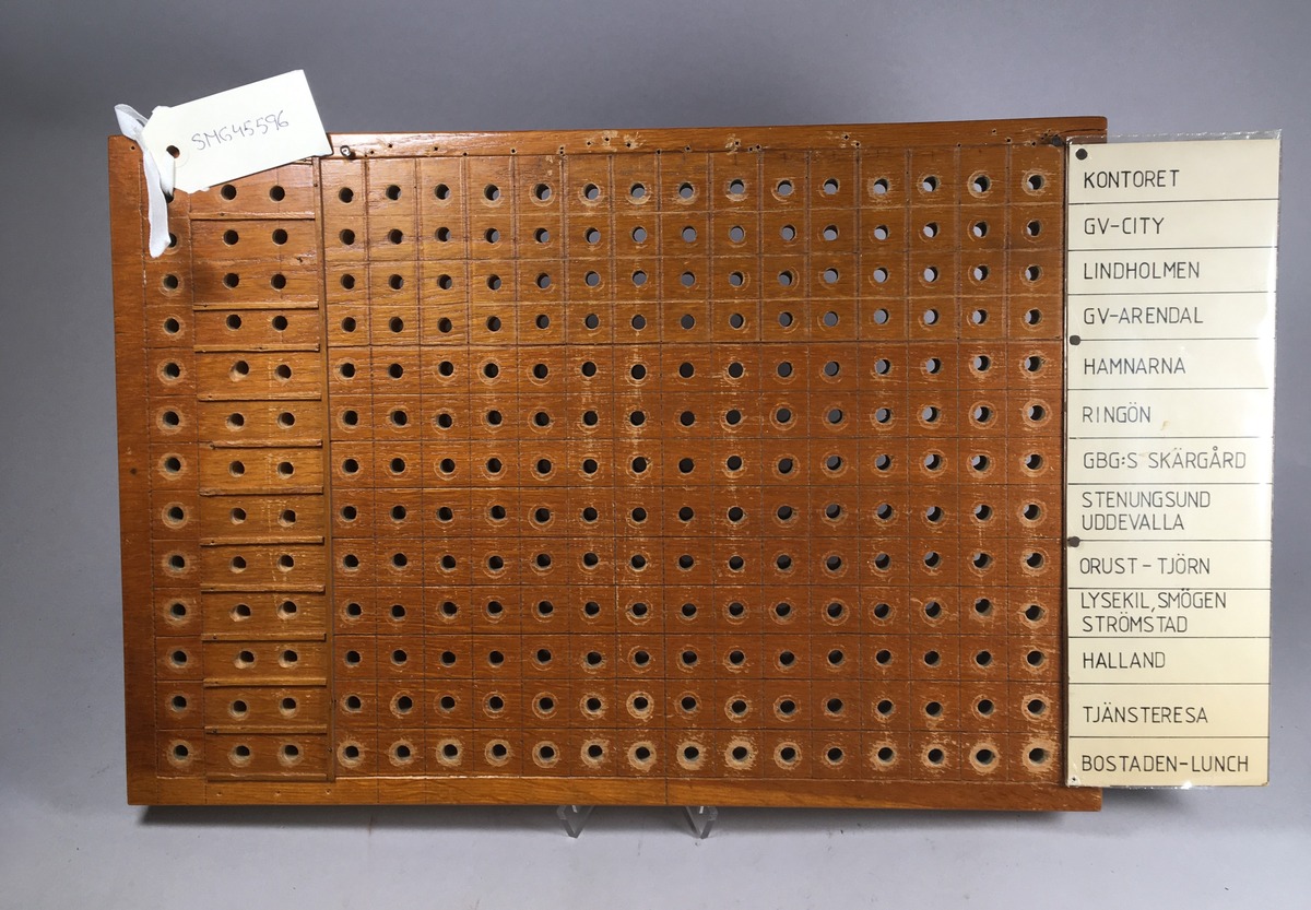 Närvarotavla i trä. Tavlan har små lister där man kan fästa namnet på den anställde samt borrade hål för markeringar. På tavlan finns även en inplastad kartongbit på högra sidan med olika platser som inspektörerna kan befinna sig under arbetsdagen.