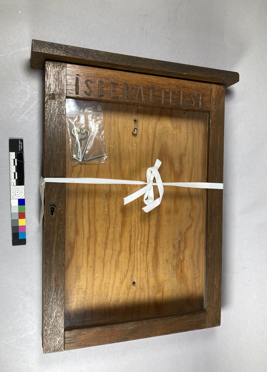Vägghängt meddelandeskåp i trä med låsbar glasdörr. Skåpet har ett litet tak som skydd för vädret och under taket finns inristade bokstäver, " Isberättelse". Skåpet användes för att sätta upp daglig information om isförhållande och liknande så att sjöfolket kunde uppdatera sig om isläget innan avgång från hamnen i Göteborg.