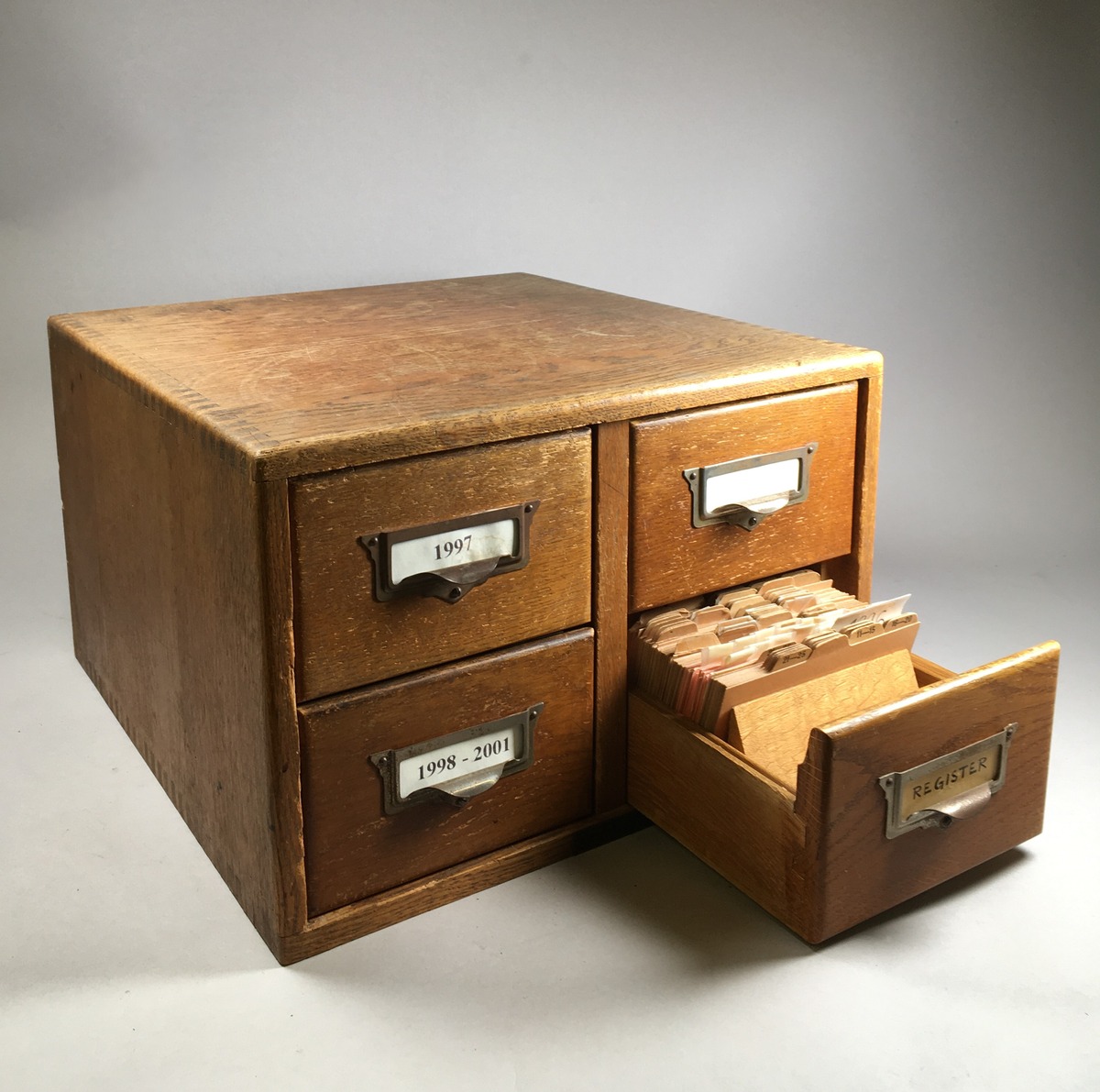 Kartotekslåda med fyra lådor för korten. För förvaring av påminnelser av besiktningar till redarna.