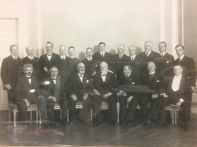 Inramat svartvitt fotografi i guldram. Föreställer en uppställning av herrar i mörk kostym, främre raden sitter ner på pallar och den bakre raden står upp. Fototillfället är fån ett möte med chalmersskeppsbyggare från olika årskurser sannorlikt före 1912.