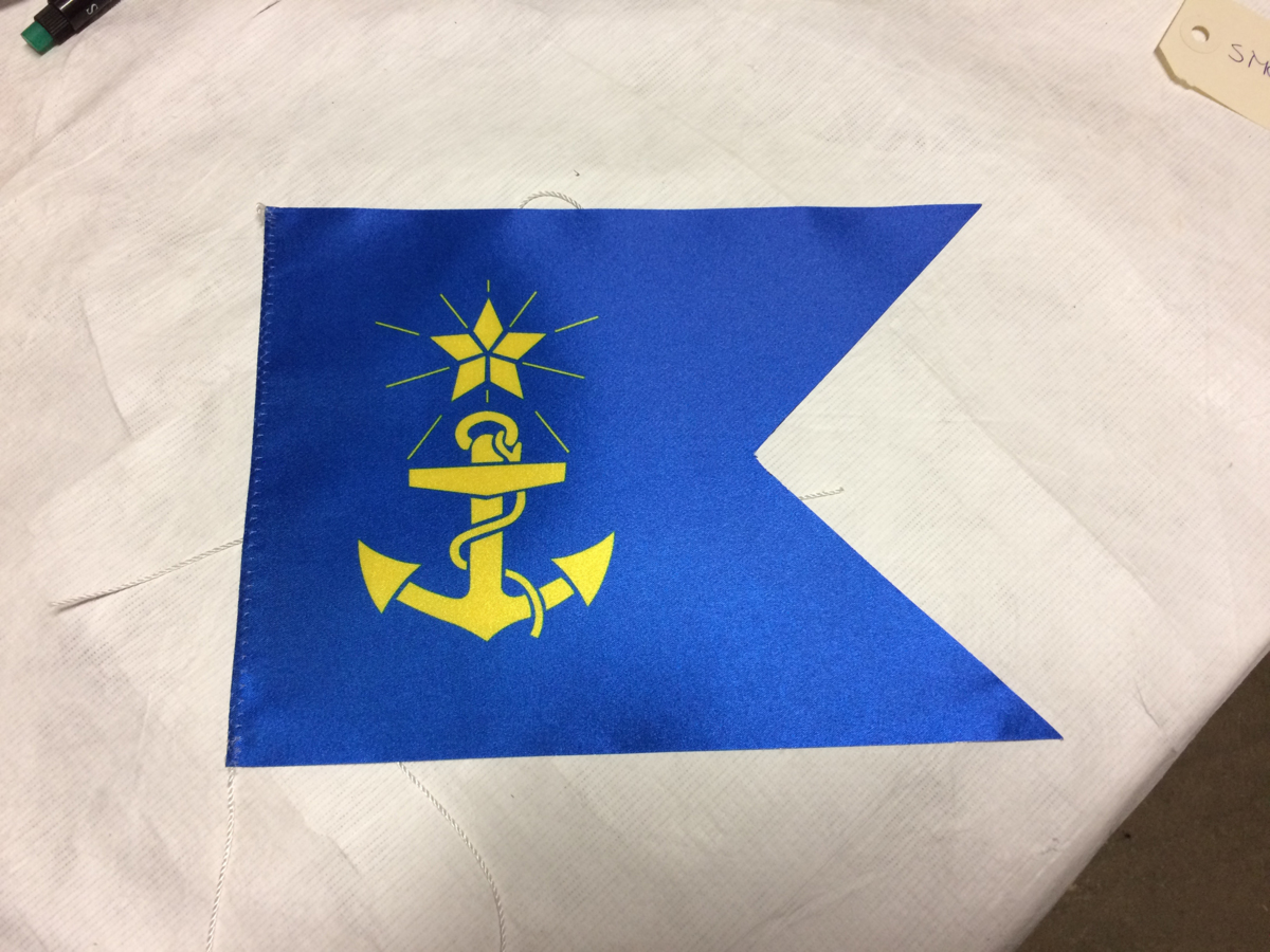 Sjöfartsverkets blåa standar med gul logga föreställande ett ankare med en skinande stjärna över. Standaret ska vara placerad på ett bord.