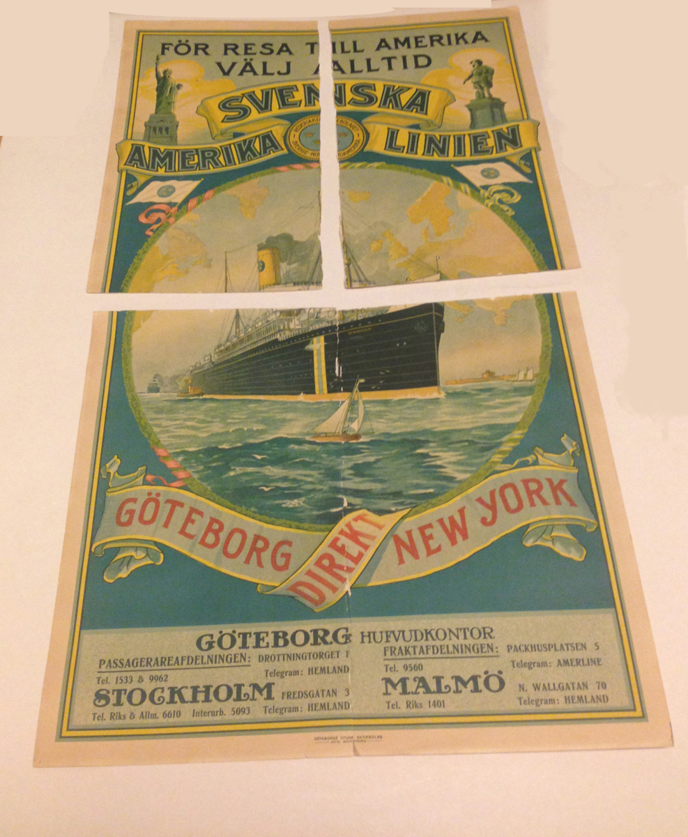 Reklamaffisch för Svenska Amerika Linien från slutet av 1920-talet. Huvudmotivet är rederiets då nybyggda fartyg KUNGSHOLM, vilket syns mot fören och styrbords sida. Fartyget är till havs och kring det syns flera mindre båtar samt i bakgrunden Nya Älvsborgs fästning. I bakgrunden finns också en karta över Europa, Atlanten och östra Nordamerika. På affischen syns också Frihetsgudinnan, en staty av Gustaf II Adolf från Gustaf Adolfs torg i Göteborg samt rederiets flagga och logga. Tryck i färgerna blått, gult och rött. Text på svenska: För resa till Amerika välj alltid Svenska Amerika Linen Göteborg direkt New York.