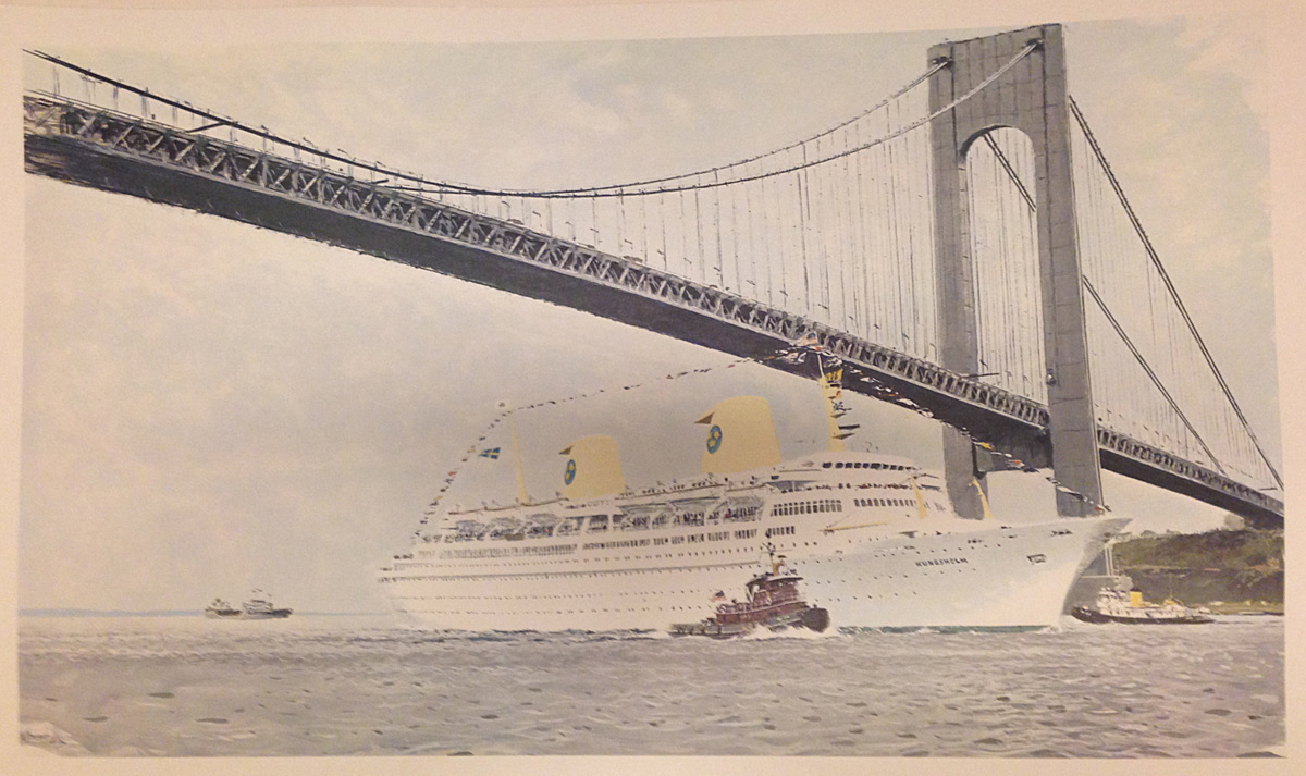 Affisch från slutet av 1960-talet som visar Svenska Amerika Liniens då nybyggda fartyg KUNGSHOLM. Fartyget passerar under Älvsborgsbron på väg in mot centrala Göteborg. Kring fartyget syns tre bogserbåtar.