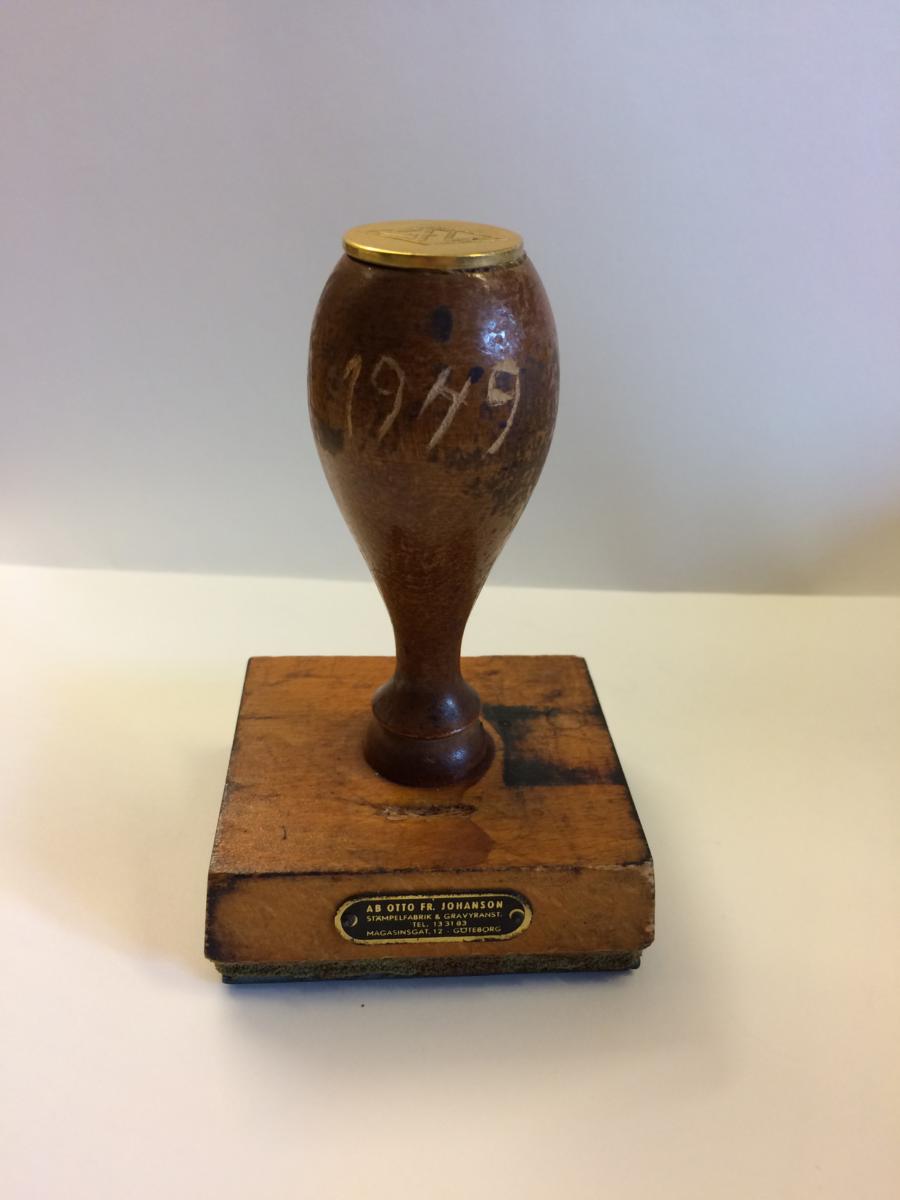 Kontorsstämpel (debet/kredit) från Sessanlinjen. Årtalet 1949 är inristat på själva greppet som också försetts med Sessanslinjens initialet GFL i form av en pålimmad rund mässingsbricka.