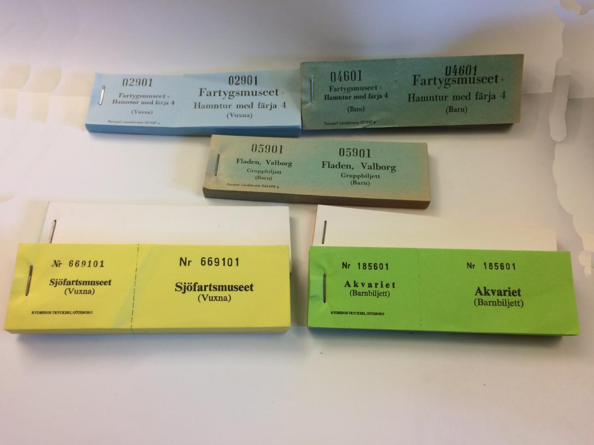 Biljetthäften i olika färger som använts i Sjöfartsmuseets verksamhet.