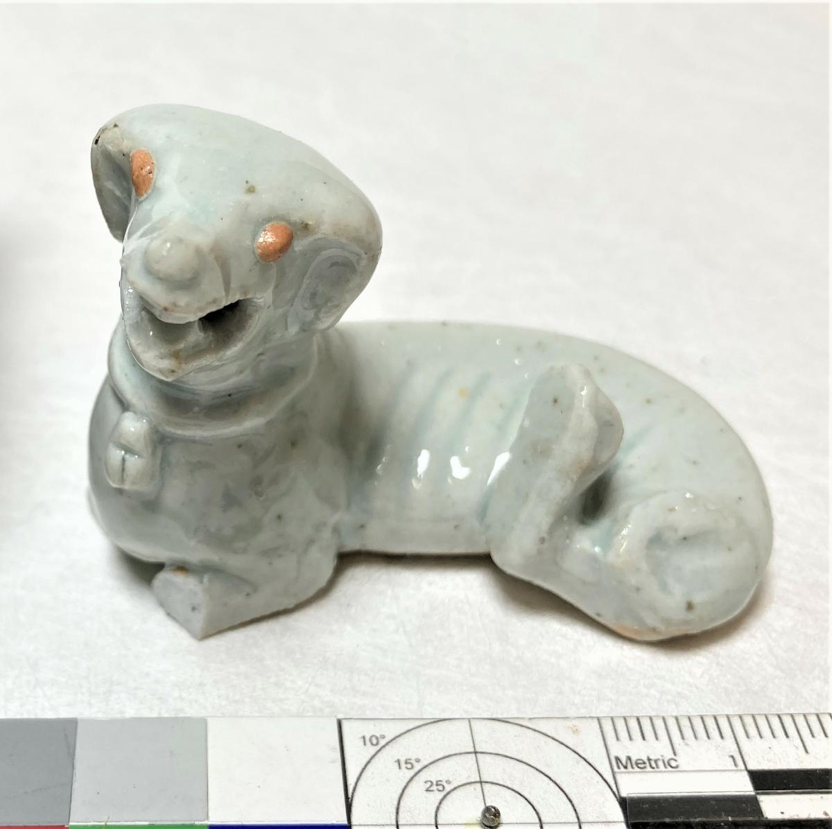 Hund i ljus turkosblå glasyr på ovansidan, oglaserad på undersidan, liggande med höger bakben under kroppen, skarabé i ett band runt halsen.