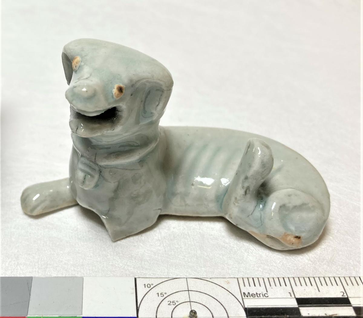 Hund i ljus turkosblå glasyr på ovansidan, oglaserad på undersidan, liggande med höger bakben under kroppen, skarabé i ett band runt halsen. Vänster framtass avbruten.