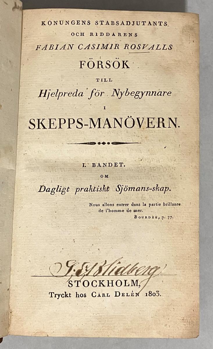 Rosvall, Fabian Casimir, Försök till hjelpreda för nybegynnare i skeppsmanövern. Bd. 1, Dagligt praktiskt sjömans-skap, Stockholm, 1803