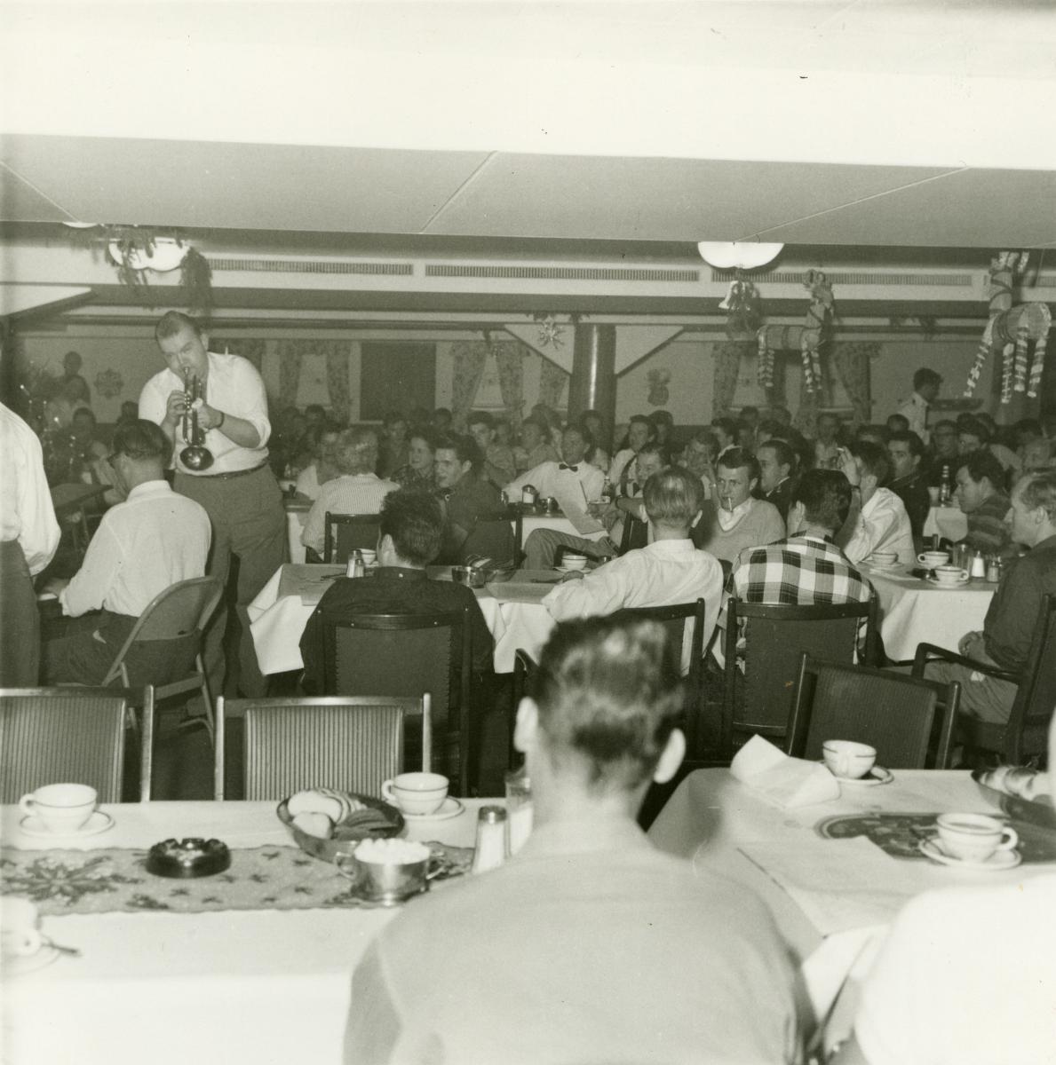 Besättningsmedlemmar ombord Svenska Amerika Liniens GRIPSHOLM har samlats för att fira julafton tillsammans 1958, ombord på fartyget. En person spelar trumpet. Fartyget är på kryssning i Västindien och på väg från New York till Trinidad, sitt första stopp för denna kryssning.