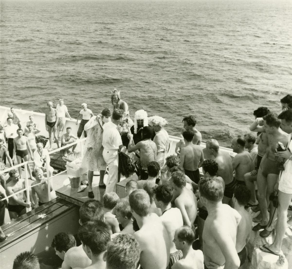 Ekvatorsdop ombord Svenska Amerika Liniens GRIPSHOLM 14 februari 1959. Fartyget är på kryssning runt Afrika och på väg från Conakry till Pointe Noire.