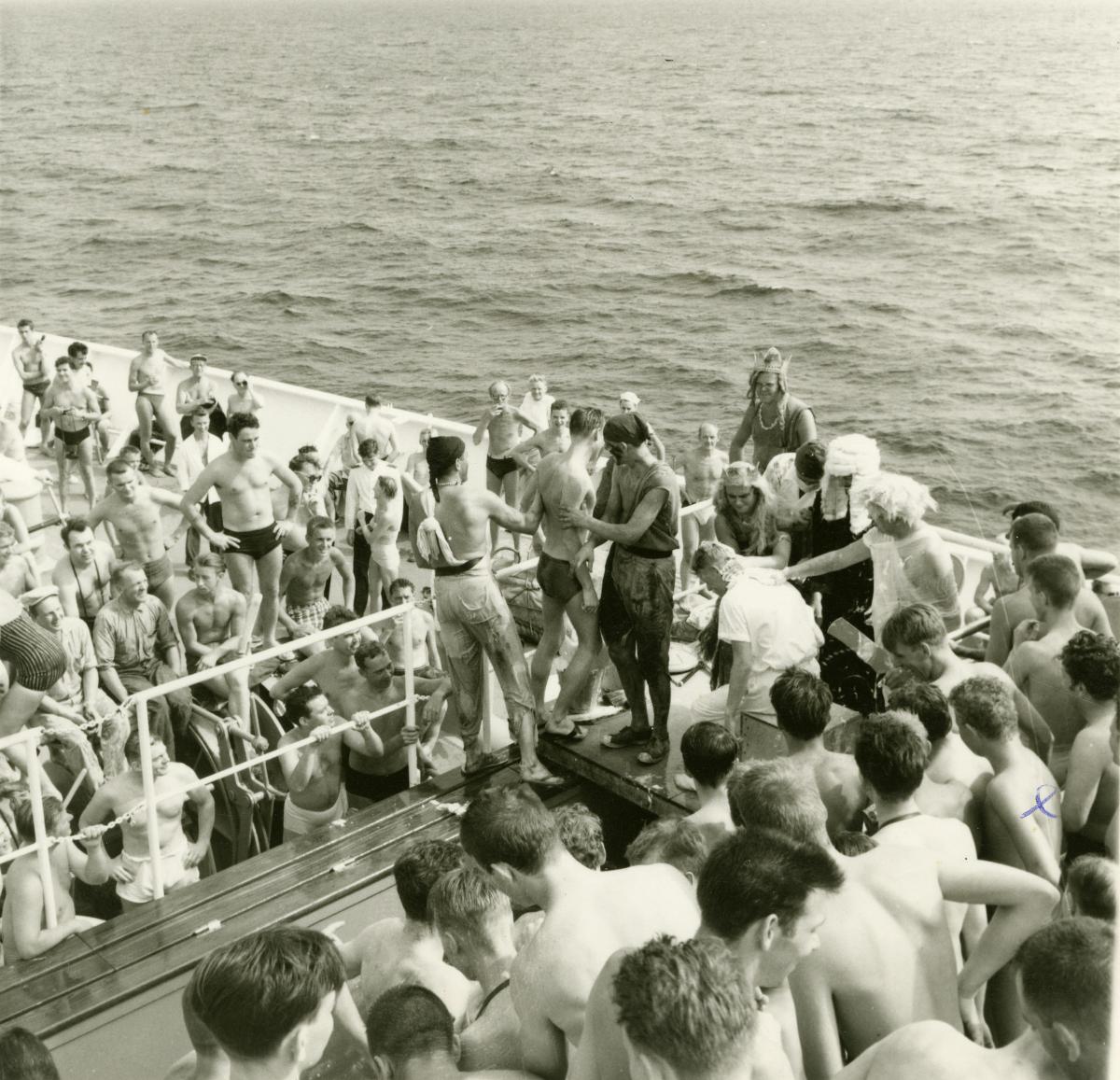 Georg Söderberg i färd med att genomgå sitt ekvatorsdop ombord Svenska Amerika Liniens GRIPSHOLM 14 februari 1959. Fartyget är på kryssning runt Afrika och på väg från Conakry till Pointe Noire.