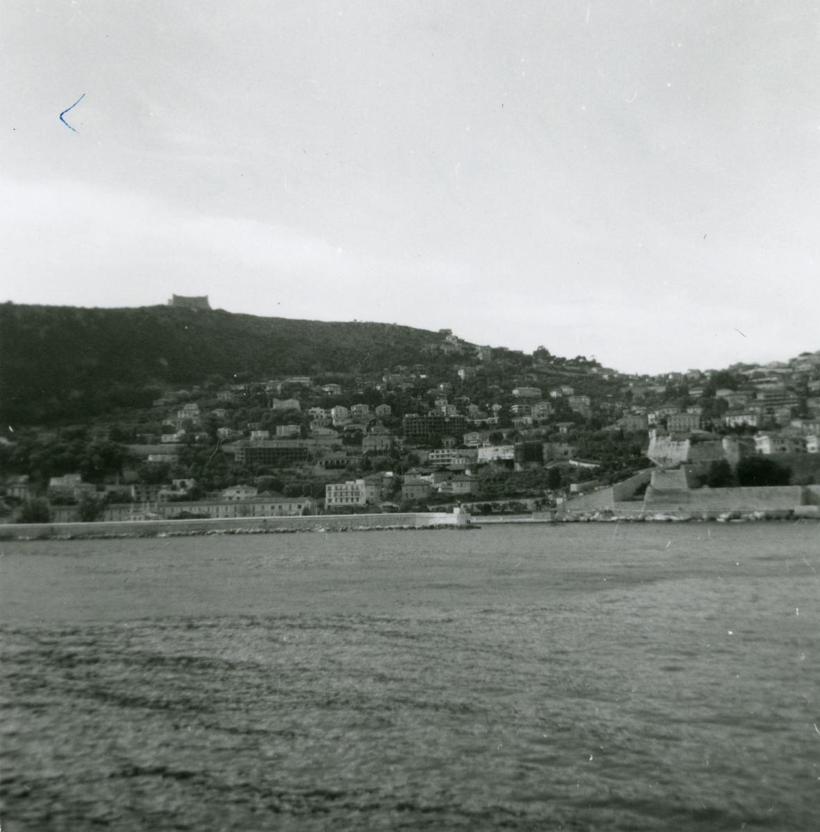 Utsikt över franska kusten vid orten Ville-Franche 26 mars 1959. Fotografiet är taget från ombord Svenska Amerika Liniens GRIPSHOLM då fartyget var på kryssning runt Afrika.