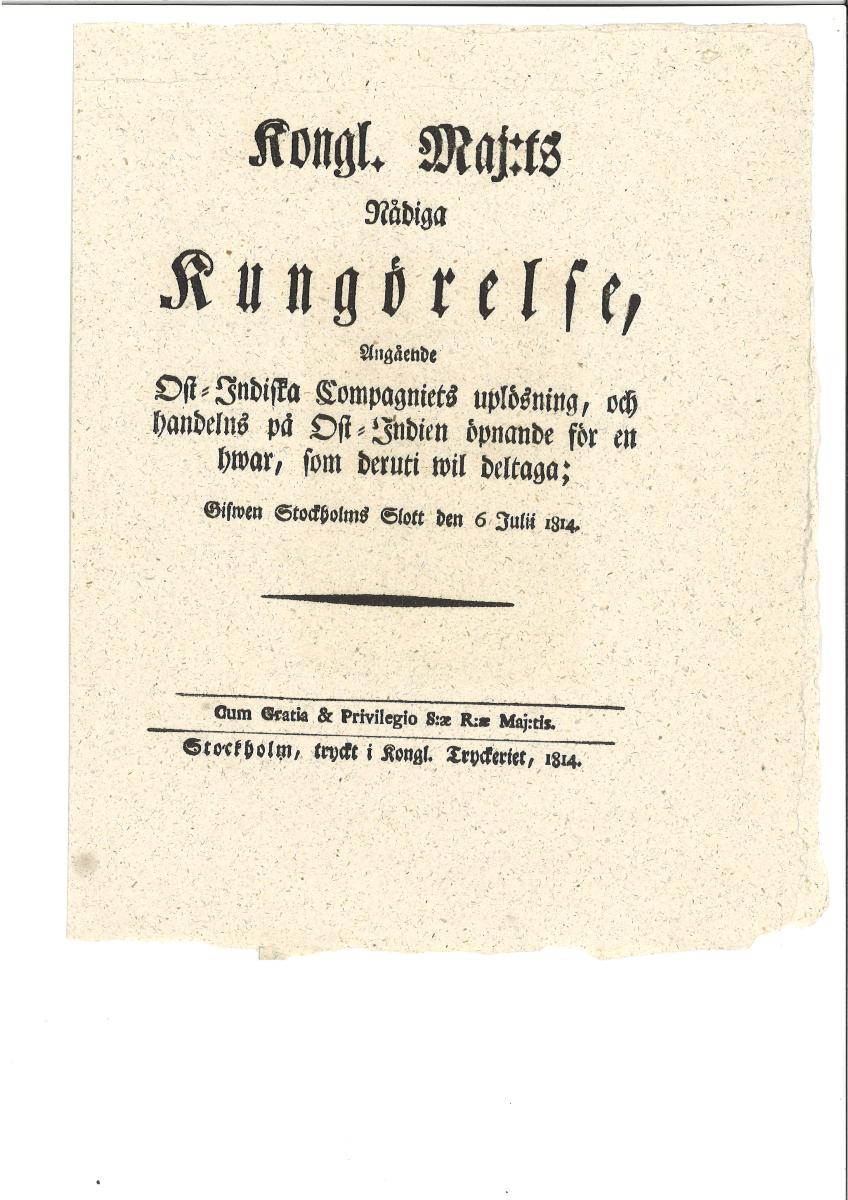 Gå tillbaka till sökLägg till i Min samlingKopiera länkSkriv utKungörelse om Svenska Ostindiska Kompaniets upplösningAktörerSvenska Ostindiska Kompaniet (SOIC) (1731 - 1813), Anknytning tillKategoriövriga dokument (Dokument, handlingar) segelfartyg (Fartygstyp)DateringTillverkningsår 1814Material och teknikPapper, TryckDimensionerGrundmått 23,00 x 18,50 cmInventarienummerSMG45660UtställdInte utställd på museet