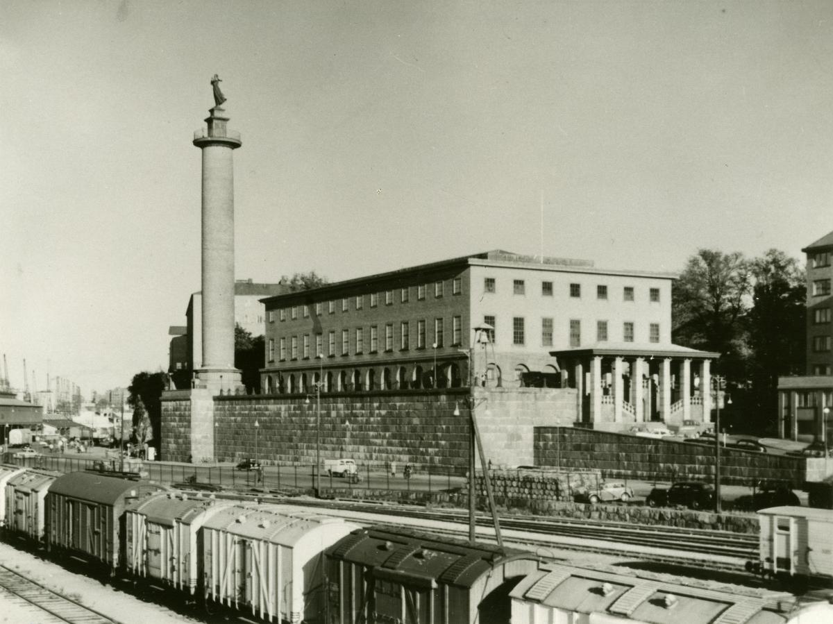 Sjömanstornet och Sjöfartsmuseet sedda från nordväst. Bilden är tagen från Amerikakajen. i förgrunden syns tåg på kajen.
