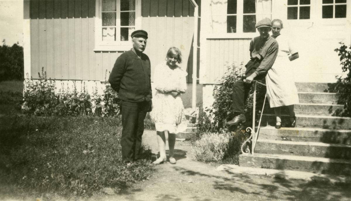 Arne och Ester Sjögren med föräldrarna Emil och Nanny år 1930. Familjen står framför sitt hus vid Ekenäs söder om Kalmar. Pappa Emil står nedanför trappan bredvid Ester. Arne och mamma Nanny står på trappan.