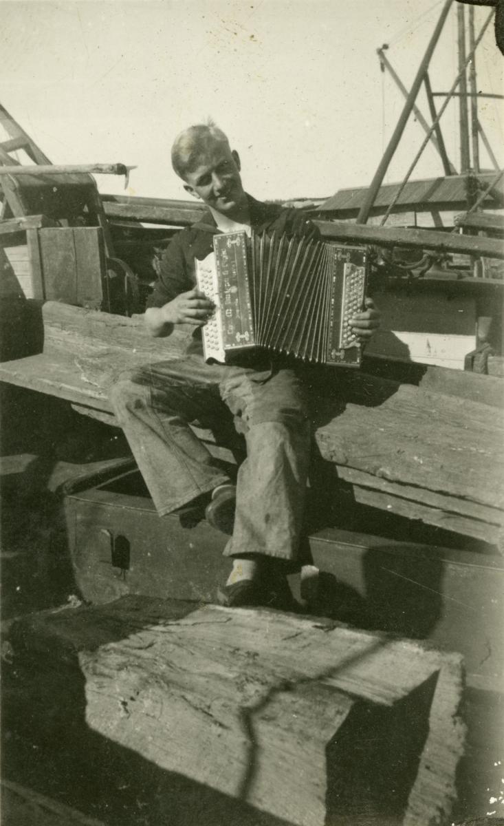 Gå tillbaka till sökLägg till i Min samlingKopiera länkSkriv utArne Sjögren spelar dragspelAktörerArne Lennart Sjögren (1916 - 1944), Avbildad Ester Linnea Sjögren (1913 - 1994), BrukareKategoribefäl och besättning (Personfoto) fritid (verksamhet ombord)DateringFöreställande tid 1931 - 1944Material och teknikFotografiInventarienummerSMGF21747UtställdInte utställd på museetBeskrivningDragspelet på bilden finns i museets samlingar som SMG45663