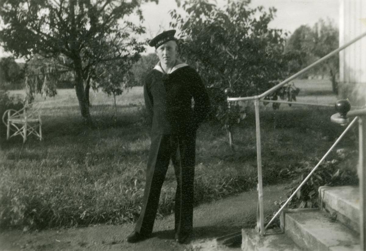 Arne Sjögren står utanför sitt föräldrahem. Han är iklädd marin uniform. Bilden är tagen i samband med hans militärtjänstgöring