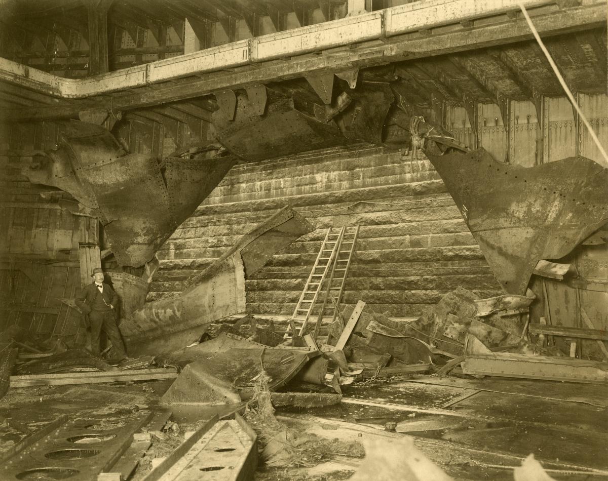 Utifrån de omfattande skadorna inuti fartyget är det sannolikt att fartyget har träffats av en projektil eller eventuellt kolliderat med något. I bakgrunden skymtar två stegar lutade mot en vägg. Sannolikt befinner sig fartyget i en docka.