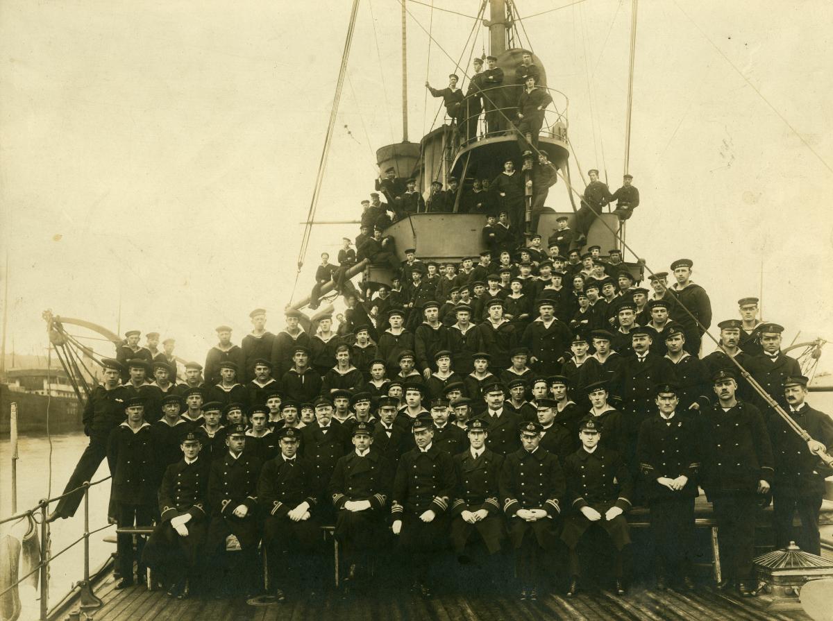 Fotografiet är sannolikt taget under första världskriget. I bakgrunden, till vänster, skymtar ett annat fartyg med neutralitetsmärkning på skrovet.