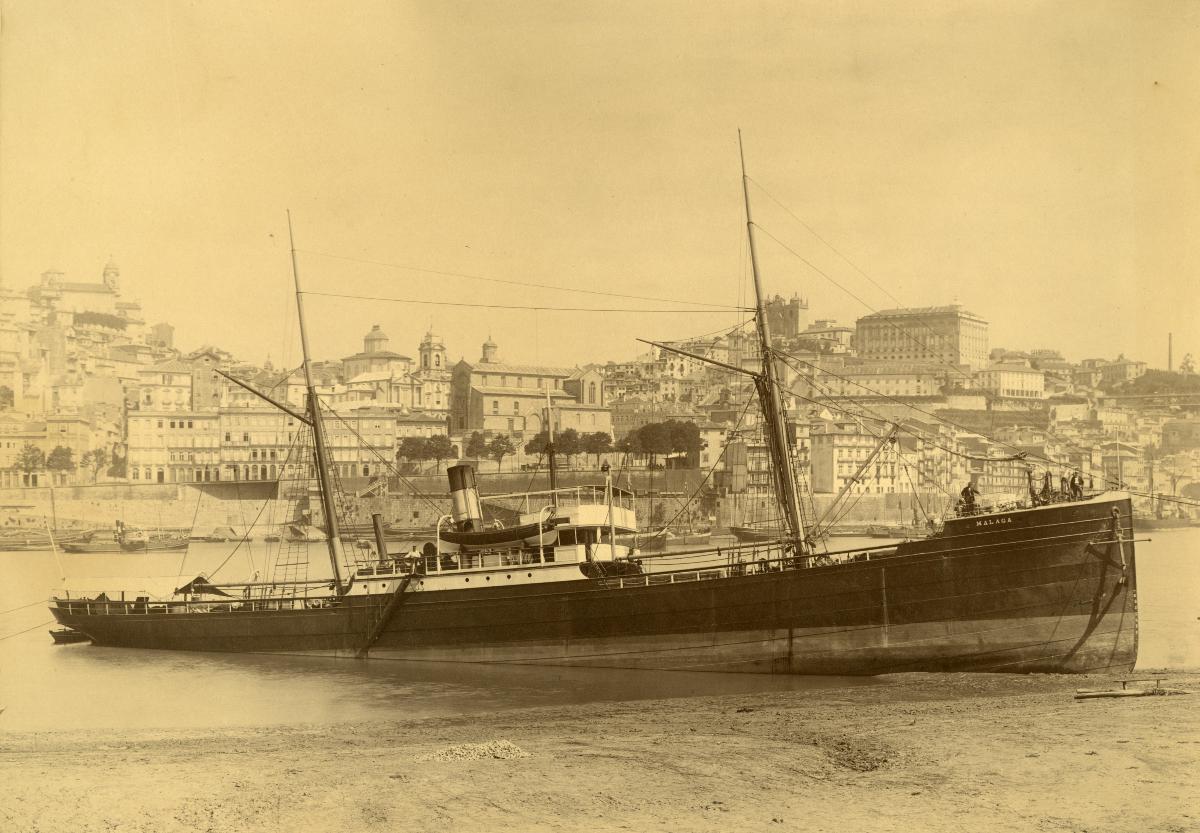 Fartyget MALAGA ligger på en strand. Antingen har fartyget strandat eller så är orsaken det låga tidvattnet. Ombord på fartyget skymtar några personer. I bakgrunden syns en stadsvy över Porto, Portugal.