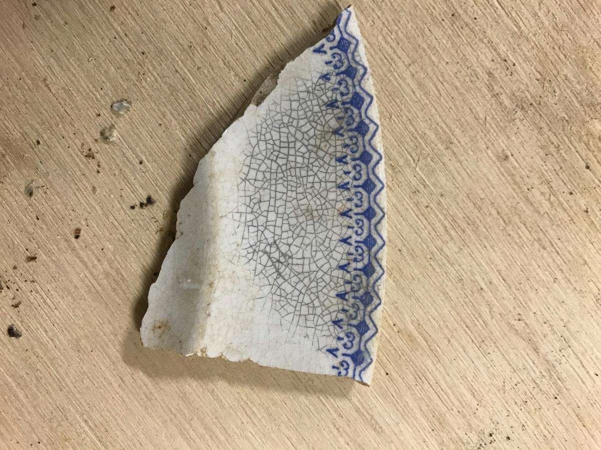 Fat i porslin, tryckt blå dekor längs kanten. Troligtsvis resent.