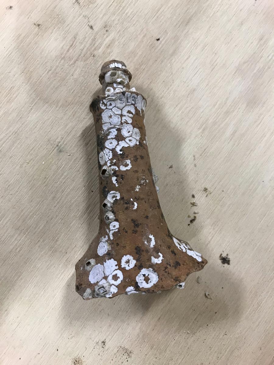Föremålet hittades av dykare från Göteborgs amatördykarklubb som 1949-1966 genomförde dykningar vid de så kallade Slamansskeppen, i samarbete med Sjöfartsmuseet. Just detta föremål hittas 1955 eller 1958 (olika uppgifter förekommer).