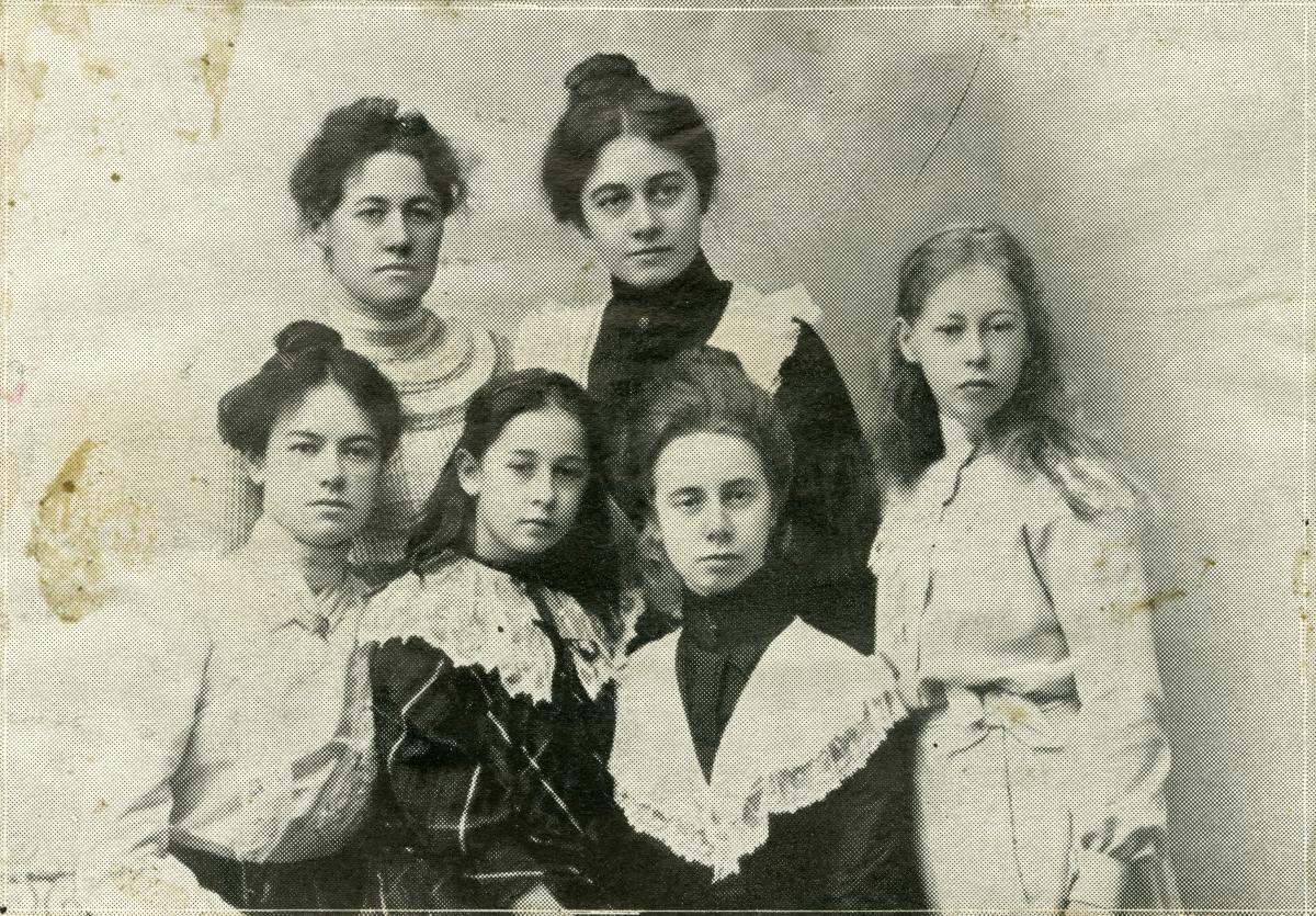 John E Olsons och Hilma Olsons sex döttrar, bland annat Disa och Svea Olson. Övriga namn är okända.