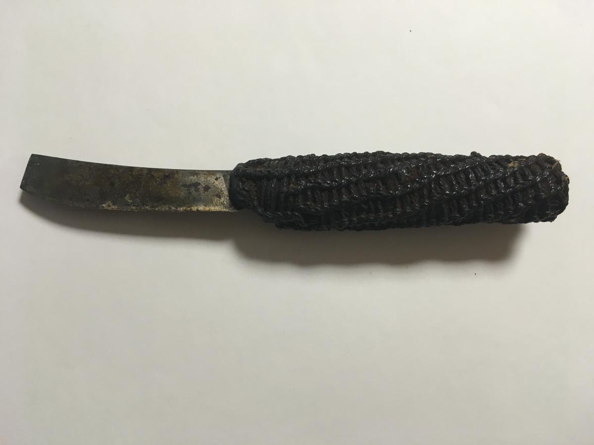 Arbetskniv med handtag av makrame. Använd av sjöman Arne Sjögren. Sannolikt har han själv tillverkat handtaget.