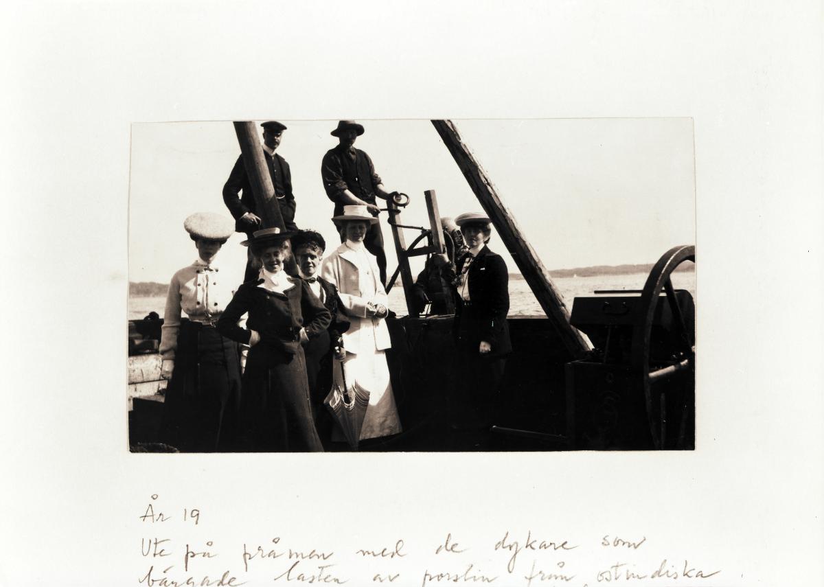 Fotografi som visar en grupp kvinnor ombord på en pråm. Pråmen användes som bas vid James Keillers och Carl Lyons projekt att bärga porslin från ostindiefararen GÖTHEBORG. Bilden är sannolikt tagen 1906. På bilden är följande personer identifierade (från vänster): Dagny Lyon, Ebba Lindström, Hilda Keiller, Alice Keiller, Ellen Lindström. Bakom kvinnorna står två män: Harry Keiller och en okänd dykare.
