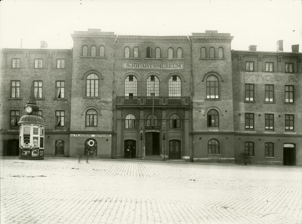 Sjöfartsmuseet öppnade för publik för första gången i februari 1913, i hyrda lokaler i byggnaden på bilden, på Skeppsbron 1. Byggnaden innehöll då redan flera företag med koppling till sjöfartssektorn samt Hotell Garni och restaurang Cafe du Commerce.
