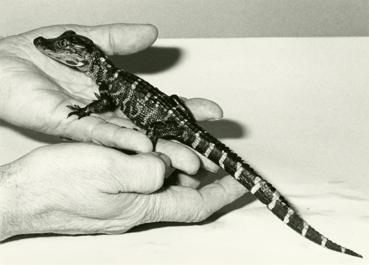 En liten två månader gammal alligator i handen på en människa. Alligatorn är en av två Mississippi-alligatorer som kom till Akvariet 1 november 1988 från Skansens akvarium i Stockholm.