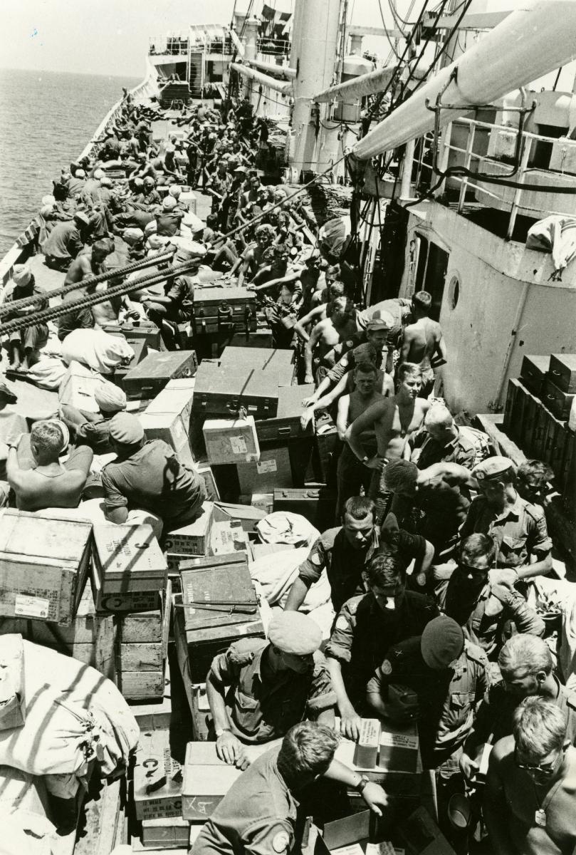 Ett stort antal män på ett fartygsdäck, tillsammans med packning och vapen. Männen är FN-soldater i färd att repatrieras, i samband med sexdagarskriget i Mellanöstern 1967.