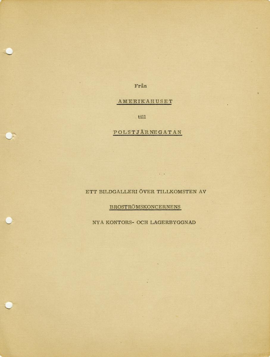 Fotoalbum med titeln "Från Amerikahuset till Polstjärnegatan. Ett bildgalleri över tillkomsten av Broströmskoncernens nya kontors- och lagerbyggnad". Innehåller bilder med tillhörande bildtext från Broströms linjeagentur (ibland kallad Broströms skeppshandel).