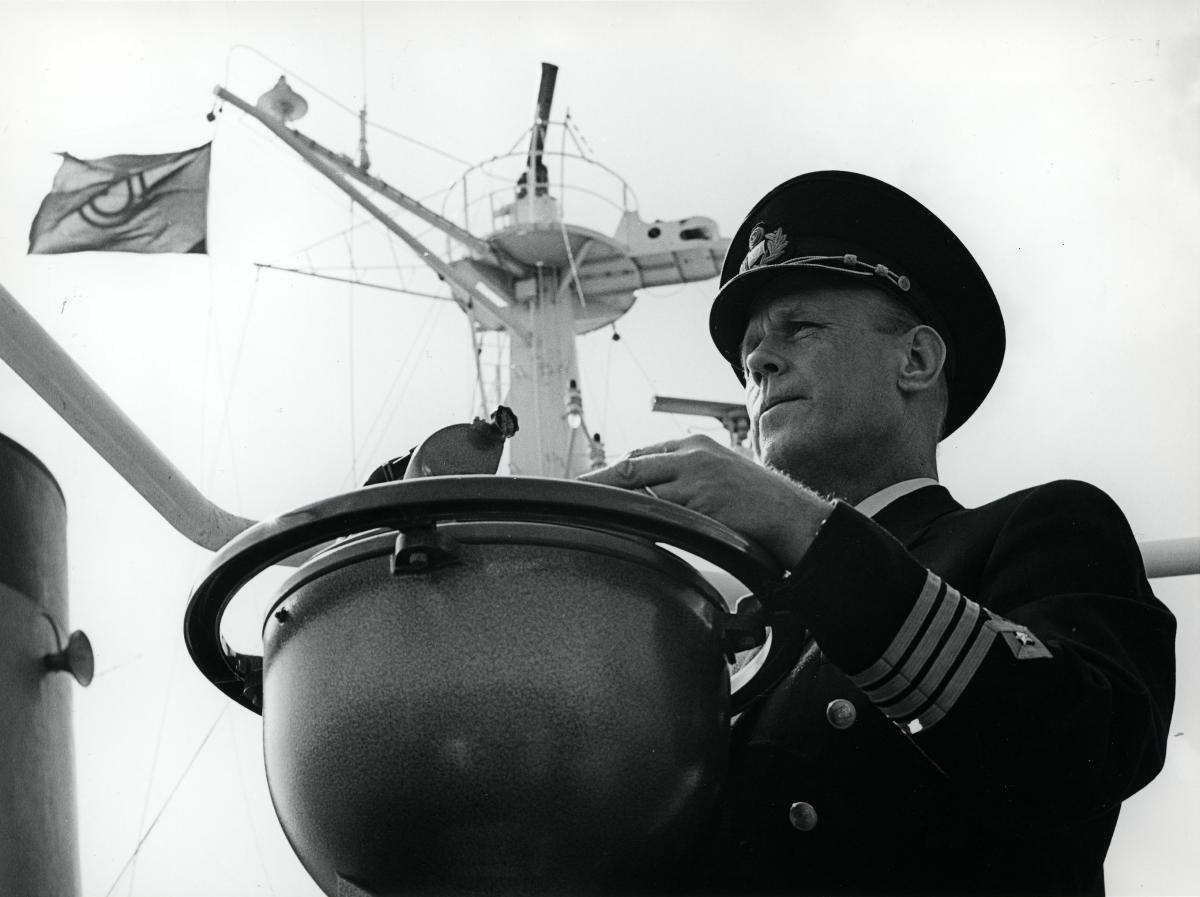 Påskrift: Kapten B. Hultberg vid pejlkompassen