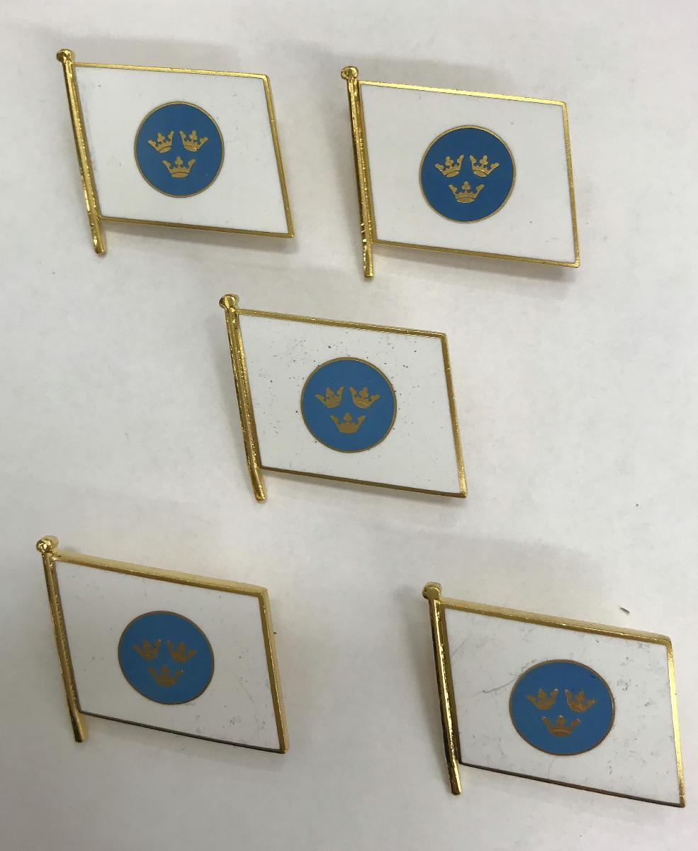 Rockslagsmärke i mässing med nål i form av rederiflagga för Svenska Amerika linjen, blå cirkel med tre förgyllda kronor mot vit botten.