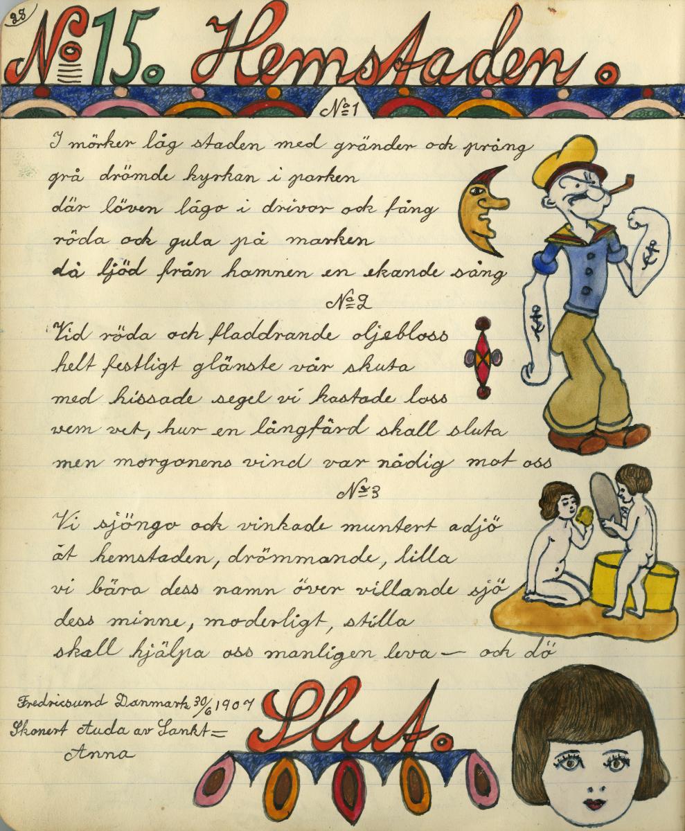 284 sidor lång visbok innehållande 136 sjömansvisor med namn så som Sjömans grav, Styrman, Sailor boy, Livets ocean, Du falska mö och Sjömanskärlek. Visboken är handskriven och illustrerad med många färgteckningar av sjömannen E. W. Lagerholm från Malmö.