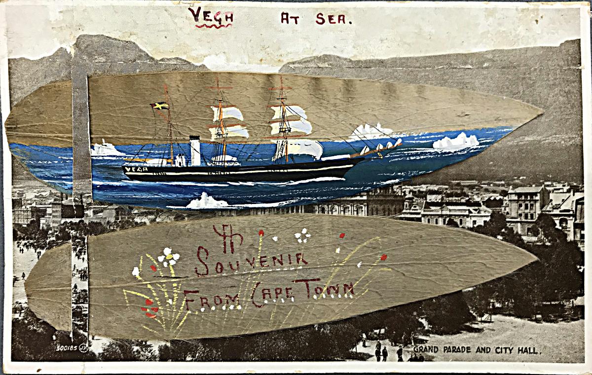 Oljemålning på tobaksblad föreställande polarfartyget VEGA till havs. Monterad på framsidan av ett vykort med motiv av en stadsvy över Kapstaden. På vykortet sitter ytterligare ett blad, på vilket det är målat blommor samt texten "A Souvenir from Cape Town".