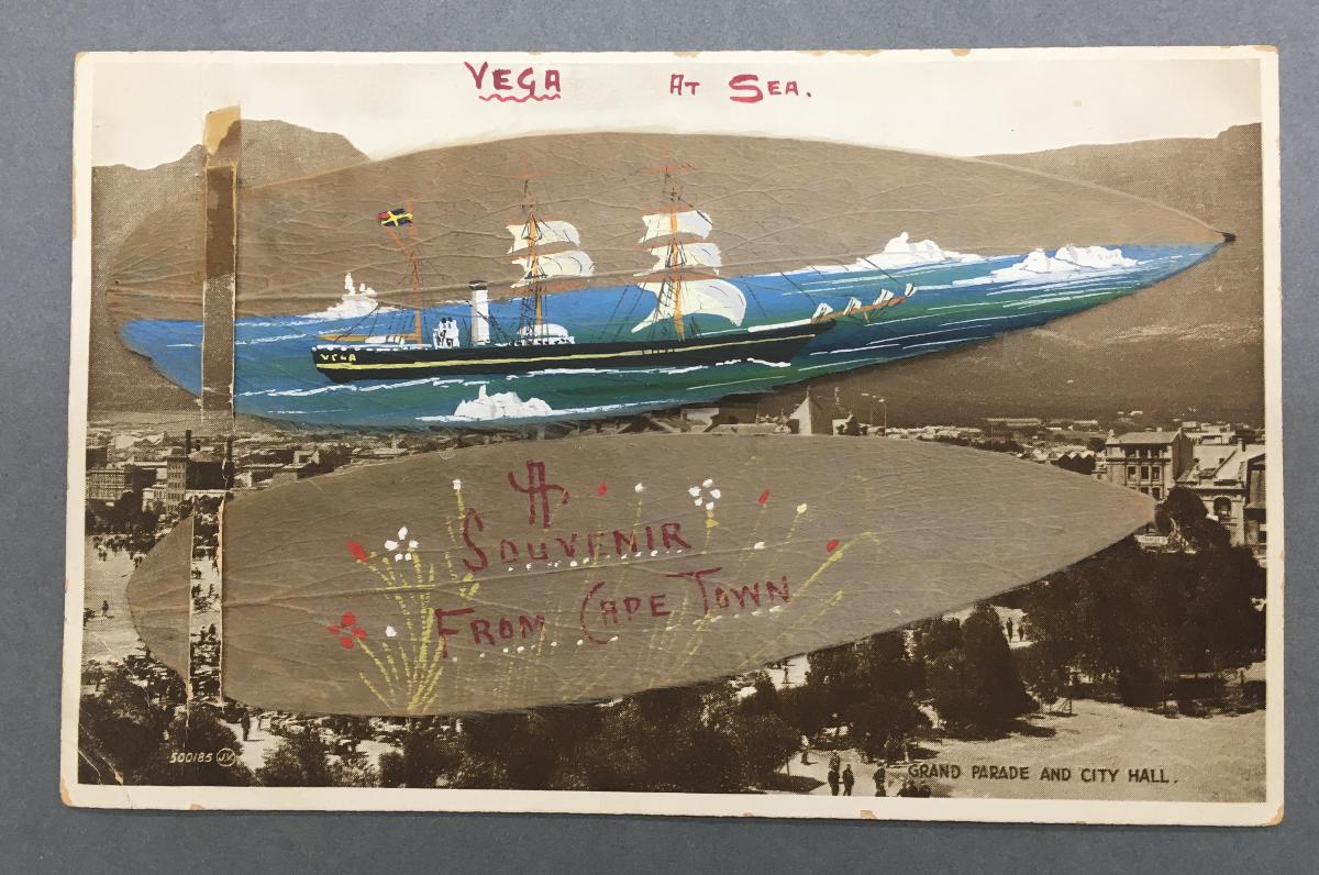 Oljemålning på tobaksblad föreställande polarfartyget VEGA till havs. Monterad på framsidan av ett vykort med motiv av en stadsvy över Kapstaden. På vykortet sitter ytterligare ett blad, på vilket det är målat blommor samt texten "A Souvenir from Cape Town".