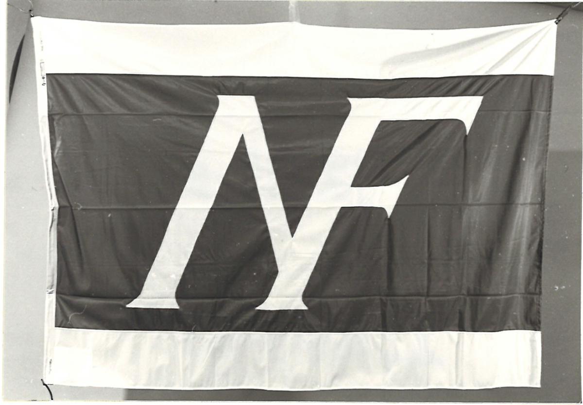 Rederiflagga för AB Nordsjöfrakt, tillverkad i poyester. Brett blått längsgående fält med infälld logotype NF i vitt, på båda sidor om det blå fältet vita smalare fält. Bakkappan är förstärkt med ofärgat bomullsband och har infälld fastgöringsanordning av blått syntet-rep med en mässingshake i övre ändan. Gåva i samband med dokumentation om Ro-Ro-fartyget m/s Anna Oden.