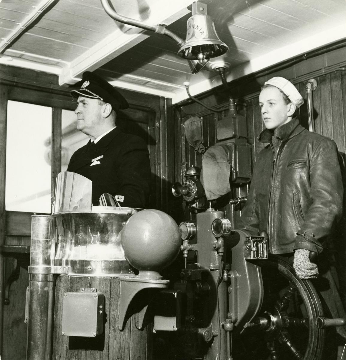 Kapten och en ung elev i styrhytten på passagerarångfartyget BRITANNIA 1957.